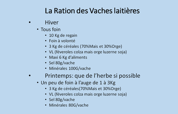L’ingestion est estimée à 18 kg de matière sèche de regain et foin par jour durant l’hiver. Le coût de la ration est estimé à 147 euros les 1000 litres de lait.