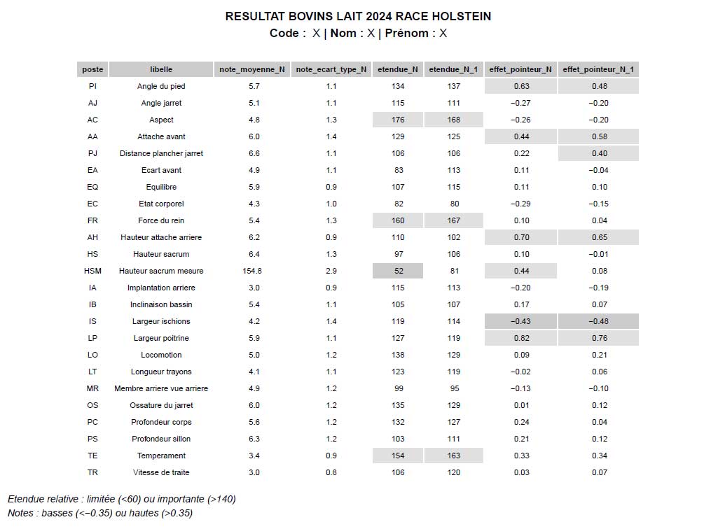 - L’étendue des notes : indique si le pointeur utilise toutes les notes de la grille de pointage, étale les notes (et donc fait des différences entre les vaches pointées), ce qui est primordial pour avoir une indexation fiable.